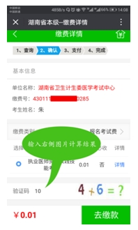 6.確認信息無誤后,輸入頁面下部圖片驗證碼計算結果,點擊“去繳款”;