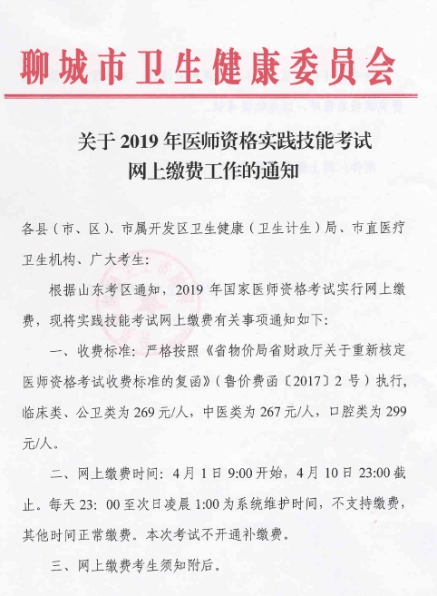 根據(jù)山東考區(qū)通知,2019年國家醫(yī)師資格考試實行網(wǎng)上繳費,現(xiàn)將實踐技能考試網(wǎng)上繳費有關(guān)事項通知如下: