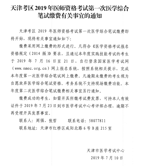 附件:天津考區(qū)2019年醫(yī)師資格考試第一次綜合筆試繳費有關(guān)事宜的通知.pdf