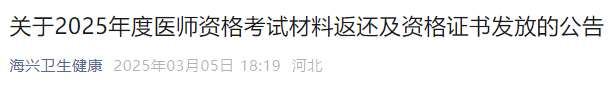 - · 河北海興開發(fā)區(qū)2025年公衛(wèi)醫(yī)師資格考試材料開始登記返還