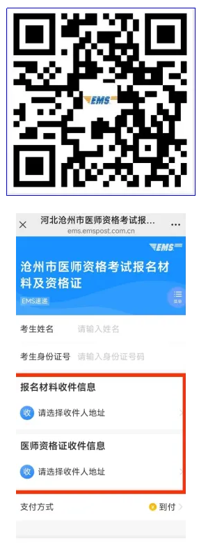 1.考生掃描下方“EMS”郵政速遞二維碼,填報相關信息進行線上申請“報名材料返回郵寄”及醫(yī)師證書郵寄業(yè)務,填寫相關信息后提交訂單。(提示:為保證順利寄出和正常投遞,請務必確保個人身份證號、手機號碼和收件地址信息準確無誤,確保手機通訊暢通。)