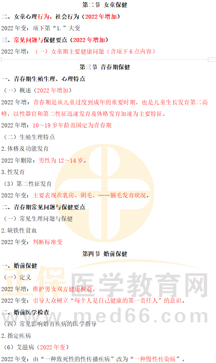 2022年公衛(wèi)執(zhí)業(yè)醫(yī)師考試大綱已經(jīng)全部公布(點(diǎn)擊下載),醫(yī)學(xué)教育網(wǎng)老師分析總結(jié)了“2022年公衛(wèi)執(zhí)業(yè)醫(yī)師考試《婦女保健學(xué)》官方教材變動(dòng)對比”的內(nèi)容,詳情如下: