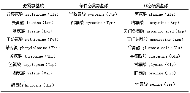 1.氨基酸 氨基酸(amino acid)是具有α-氨基和羧基的一類含有復(fù)合官能團(tuán)的化合物,也是組成蛋白質(zhì)的基本單位。構(gòu)成人體蛋白質(zhì)的氨基酸有20種(不包括胱氨酸,cystine),可以分成必需氨基酸(essential amino acid)、條件必需氨基酸(conditionally essential amino acid)和非必需氨基酸三類,見下表。