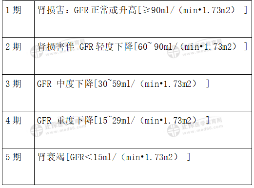 近年來根據(jù)國際公認指南,臨床按照腎小球濾過率的水平將慢性腎臟病分為5期,其中2~5期為慢性腎衰竭的不同階段:
