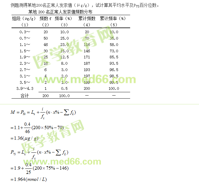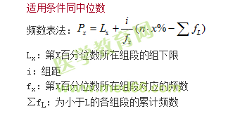 百分位數(shù)(percentile)用Px(第x百分位數(shù))表示,也是一種位置指標,醫(yī)學|教育網(wǎng)觀察值按由小到大的順序排列后,一個百分位數(shù)Px將全部變量值分為兩部分,其中有x%的變量值比它小,(100——x)%變量值比它大。P50=M