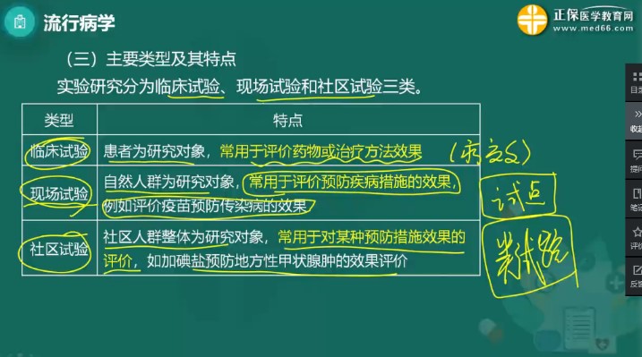 ②現(xiàn)場試驗:自然人群為研究對象,常用于評價預防疾病措施的效果,例如評價疫苗預防傳染病的效果;