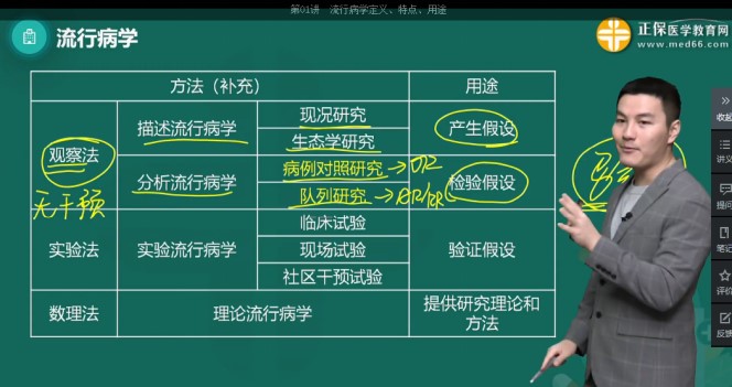 通過下面一個(gè)圖片來把這個(gè)內(nèi)容掌握吧,把這個(gè)分類和用途掌握好了,后面學(xué)習(xí)具體的方法的時(shí)候會(huì)更加容易,不要小看這一個(gè)小小的表格,其有好多個(gè)出題點(diǎn),比如哪個(gè)方法屬于實(shí)驗(yàn)流行病學(xué),現(xiàn)況研究的用途是什么等,這些類似的題目在以往的考試中都出現(xiàn)過。這個(gè)表格內(nèi)容,基本每年都會(huì)有1分的考題。