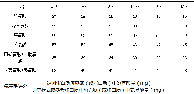 氨基酸評(píng)分和經(jīng)消化率修正的氨基酸評(píng)分:氨基酸評(píng)分(AAS)也叫蛋白質(zhì)化學(xué)評(píng)分,是通過測定蛋白質(zhì)的必需氨基酸組成,并將各組分與參考蛋白或推薦的氨基酸評(píng)分模式相比較,發(fā)現(xiàn)其中最缺乏的氨基酸即限制性氨基酸,然后計(jì)算其與參考蛋白或推薦的氨基酸評(píng)分模式中相應(yīng)的必需氨基酸的比值。例如,某被測蛋白質(zhì)的限制氨基酸含量相當(dāng)于參考蛋白中同種氨基酸的70%,那么它的氨基酸評(píng)分即是70。不同年齡的人群,其氨基酸評(píng)分模式也不同。(見下表)