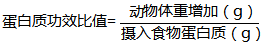 (3)蛋白質(zhì)功效比值:蛋白質(zhì)功效比值(protein efficiency ratio,PER)是用生長(zhǎng)實(shí)驗(yàn)的方法反映食物蛋白質(zhì)利用率的指標(biāo)。一般使用處于生長(zhǎng)階段的幼年動(dòng)物(剛斷奶的雄性大鼠),測(cè)定其在實(shí)驗(yàn)期內(nèi)體重增加(g)和蛋白質(zhì)攝入量(g)的比值。顯然,動(dòng)物攝食持續(xù)時(shí)間、年齡、實(shí)驗(yàn)開(kāi)始的體重和所用動(dòng)物的種類都是很重要的變量。由于所測(cè)蛋白質(zhì)主要被用來(lái)提供生長(zhǎng)之需要,所以該指標(biāo)被廣泛用于嬰幼兒食品中蛋白質(zhì)的評(píng)價(jià)。