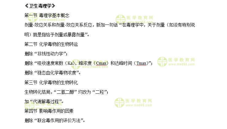 2019公衛(wèi)執(zhí)業(yè)醫(yī)師應(yīng)試指南內(nèi)容變動:藥理學(xué)相關(guān)信息,相信很多人比較感興趣,下面醫(yī)學(xué)教育網(wǎng)小編將2019年公衛(wèi)執(zhí)業(yè)醫(yī)師考試教材《衛(wèi)生毒理學(xué)》變動內(nèi)容匯總整理如下,希望對各位備考提供助力。