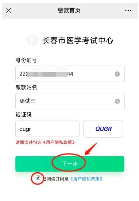 2、輸入身份證號、姓名、驗(yàn)證碼,勾選下方《用戶隱私政策》,點(diǎn)擊“下一步”。如下圖。(他人代繳,請輸入?yún)⒓涌荚嚨目忌救诵畔?/strong>)