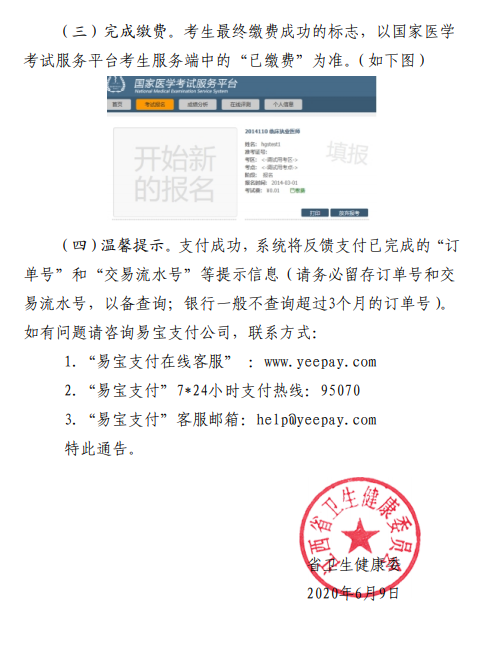 考生通過報(bào)名資格審核后,在規(guī)定時(shí)間內(nèi)(2020年6月15日—6月30日)繳納實(shí)踐技能考試費(fèi);實(shí)踐技能考試合格后,在規(guī)定時(shí)間內(nèi)(2020年7月29日—8月10日),繳納醫(yī)學(xué)綜合考試費(fèi)。