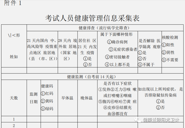 1、考生納入考試人員健康管理,考前 14 天起每天采取自 查自報(bào)方式進(jìn)行健康監(jiān)測(cè),填寫《考試人員健康信息采集表》(附 件 1)、《考生健康申明卡及安全考試承諾書(shū)》(附件 2),并打印 紙質(zhì),考生入場(chǎng)時(shí)需要上交以上 2 個(gè)附件至考試基地。對(duì)于考 試瞞報(bào)、虛報(bào)個(gè)人旅居史和健康癥 狀的,依法依規(guī)予以處理。2、請(qǐng)各位考生主動(dòng)學(xué)習(xí)疫情防控知識(shí),強(qiáng)化疫情防控責(zé)任 和意識(shí),嚴(yán)格 遵守疫情防控規(guī)定,及時(shí)按規(guī)定如實(shí)報(bào)告?zhèn)€人健 康狀況,自覺(jué) 接受疫情防控管理。3、考生屬于以下情形的,納入考點(diǎn)所在地疫情防控體系, 視情況確定是否參加考試:(1)治愈出院的確診病例和無(wú)癥狀感染者,在結(jié)束集中隔 離觀察 14 天及居家隔離 14 天后,持考前 7 天內(nèi)的健康體檢報(bào) 告, 體檢正常、肺部影像學(xué)顯示肺部病灶明顯吸收、2 次間隔 24 小時(shí) 核酸檢測(cè)(痰或咽拭子+糞便或肛拭子)均為陰性的, 可參加考試。(2)開(kāi)考前 14 天內(nèi)有發(fā)熱、咳嗽等癥狀已痊愈或能排除 傳 染病的,持醫(yī)療機(jī)構(gòu)出具的診斷證明和考前 48 小時(shí)內(nèi)的核酸檢 測(cè)陰性報(bào)告可以參加考試。(3)屬于以下情形的,不得參加考試:確診病例、疑似病 例、無(wú)癥狀感染者和尚在隔離觀察期的密切接觸者;開(kāi)考前 14 天內(nèi)有發(fā)熱、咳嗽等癥狀未痊愈且未排除傳染病者;有中、高 風(fēng) 險(xiǎn)等疫情重點(diǎn)地區(qū)旅居史且離開(kāi)上述地區(qū)不滿 21 天者;考生居 住社區(qū) 21 天內(nèi)發(fā)生疫情者;有境外旅居史且入境未滿 28 天者。