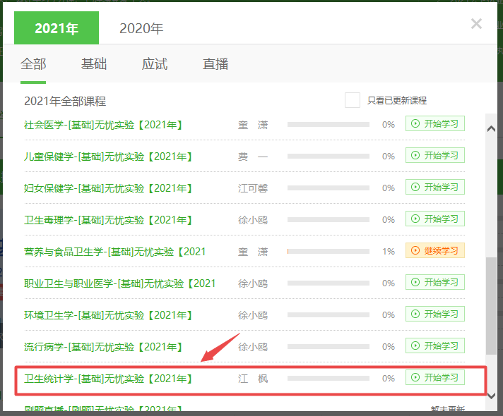 2021年公衛(wèi)執(zhí)業(yè)醫(yī)師考試江楓老師《衛(wèi)生統(tǒng)計學(xué)》基礎(chǔ)學(xué)習(xí)班新課開通啦!已購課同學(xué)可以直接進入我的網(wǎng)校我的家-我的課程-衛(wèi)生統(tǒng)計學(xué)科目進行學(xué)習(xí)!未購課學(xué)員點擊此處進入選擇,具體看課位置如下: