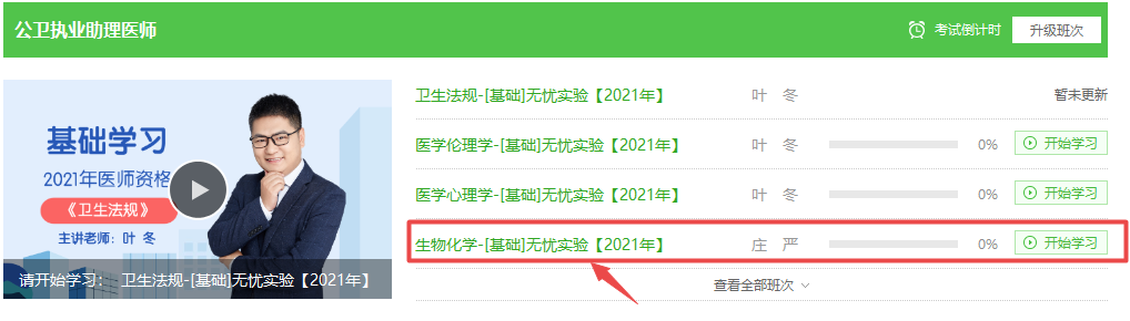 2021年公衛(wèi)執(zhí)業(yè)助理醫(yī)師基礎(chǔ)學(xué)習(xí)班莊嚴(yán)老師【生物化學(xué)】科目新課更新!已購課同學(xué)可以直接進(jìn)入我的網(wǎng)校我的家-我的課程-生物化學(xué)科目進(jìn)行學(xué)習(xí)!2021年公衛(wèi)助理醫(yī)師生物化學(xué)考試大綱無變動(dòng),2021年新教材有部分變動(dòng)。具體內(nèi)容下方查看。未購課學(xué)員點(diǎn)擊此處進(jìn)入選擇,具體看課位置如下: