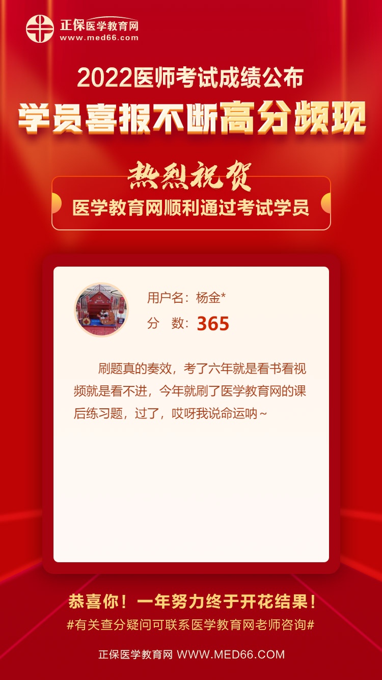 2022年醫(yī)師資格考試成績(jī)公布后,醫(yī)學(xué)教育網(wǎng)學(xué)員喜報(bào)不斷,高分頻現(xiàn)!在此醫(yī)學(xué)教育網(wǎng)小編熱烈祝賀各位順利通過(guò)考試的同學(xué)!同時(shí)也將大家成功的喜悅、備考心得一起分享給2023年考生。一起來(lái)看看吧!