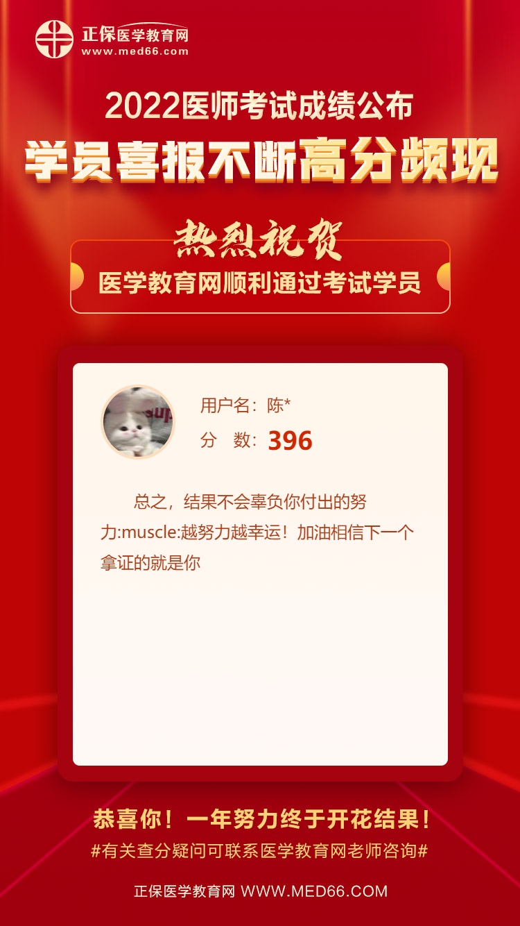 2022年醫(yī)師資格考試成績(jī)公布后,醫(yī)學(xué)教育網(wǎng)學(xué)員喜報(bào)不斷,高分頻現(xiàn)!在此醫(yī)學(xué)教育網(wǎng)小編熱烈祝賀各位順利通過(guò)考試的同學(xué)!同時(shí)也將大家成功的喜悅、備考心得一起分享給2023年考生。一起來(lái)看看吧!