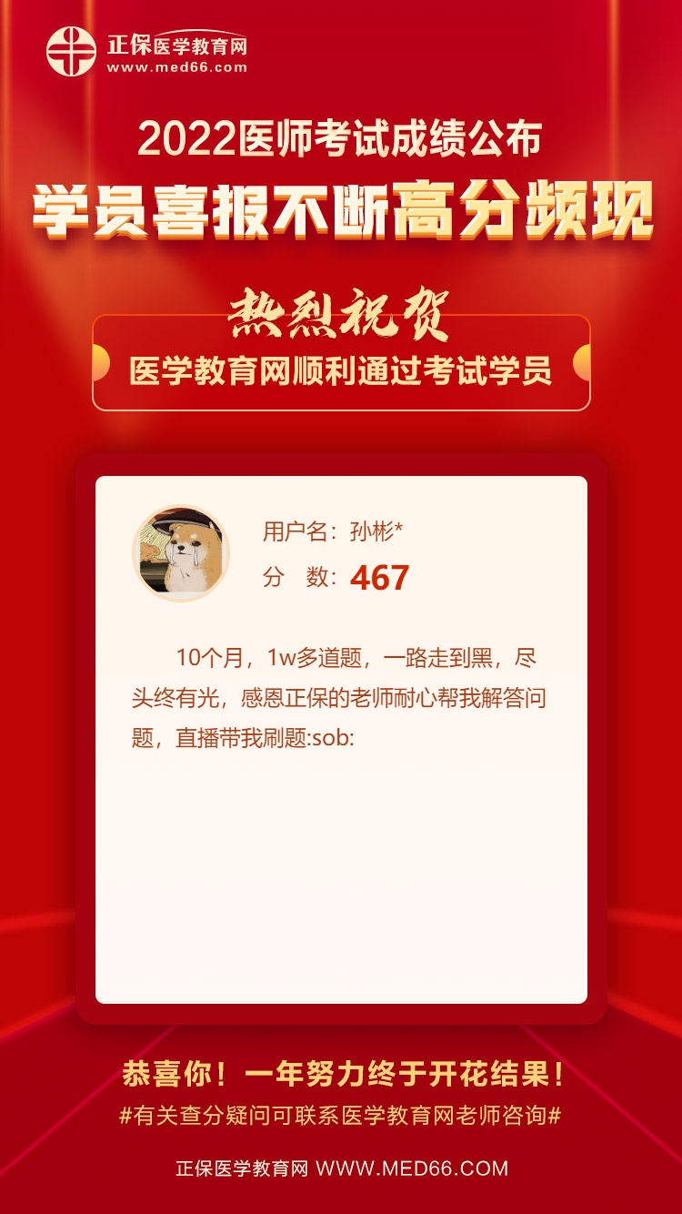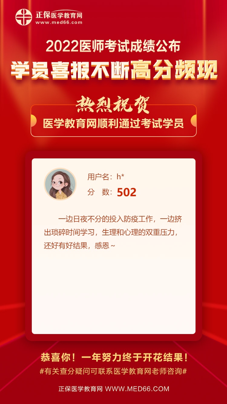 2022年醫(yī)師資格考試成績公布后,醫(yī)學(xué)教育網(wǎng)學(xué)員喜報(bào)不斷,高分頻現(xiàn)!在此醫(yī)學(xué)教育網(wǎng)小編熱烈祝賀各位順利通過考試的同學(xué)!同時也將大家成功的喜悅、備考心得一起分享給2023年考生。一起來看看吧!