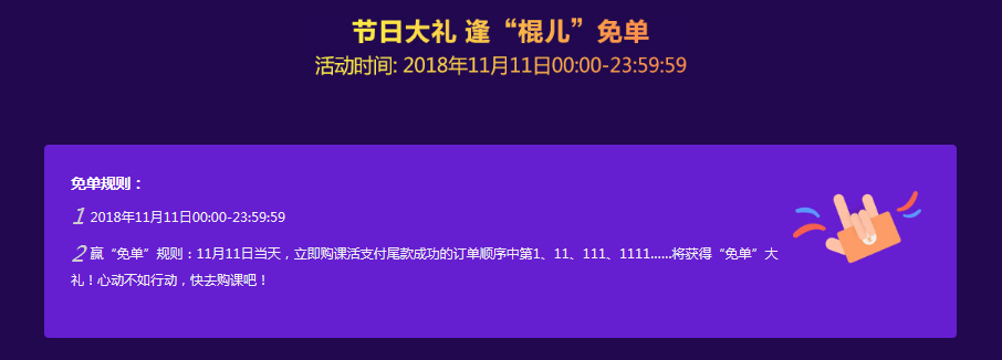 2、贏“免單”規(guī)則:11月11日當(dāng)天,立即購課成功的訂單順序中第1、11、111、1111……將獲得“免單”大禮!