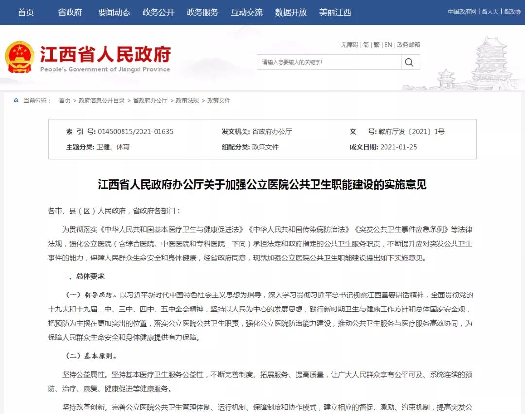為不斷提升應(yīng)對(duì)突發(fā)公共衛(wèi)生事件的能力,保障人民群眾生命安全和身體健康,近日,江西出臺(tái)《關(guān)于加強(qiáng)公立醫(yī)院公共衛(wèi)生職能建設(shè)的實(shí)施意見(jiàn)》(以下簡(jiǎn)稱《意見(jiàn)》)。目標(biāo)到2022年底,公立醫(yī)院公共衛(wèi)生體系制度框架基本建立,到2025年,公立醫(yī)院公共衛(wèi)生體系框架成熟定型,提供集預(yù)防保健、疾病監(jiān)測(cè)、疾病救治、應(yīng)急救援、健康教育為一體的整合型醫(yī)療衛(wèi)生服務(wù)。