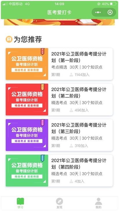 第三步:選擇備考科目后即進(jìn)入學(xué)習(xí)計(jì)劃選擇的頁面,請選擇“您的備考計(jì)劃”,如公衛(wèi)醫(yī)師備考計(jì)劃(第四階段),然后點(diǎn)擊下方“加入計(jì)劃 開始學(xué)習(xí)”按鈕,開始正式進(jìn)入打卡學(xué)習(xí)。
