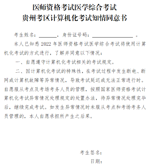 醫(yī)師資格考試醫(yī)學(xué)綜合考試計(jì)算機(jī)化考試知情同意書(shū)(貴州考區(qū))