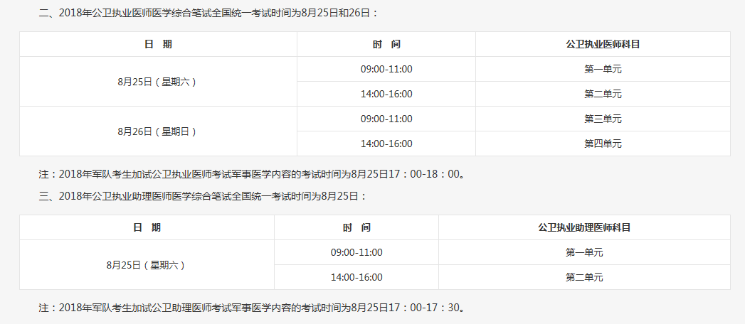 二、2018年公衛(wèi)執(zhí)業(yè)醫(yī)師醫(yī)學(xué)綜合筆試全國(guó)統(tǒng)一考試時(shí)間為8月25日和26日: