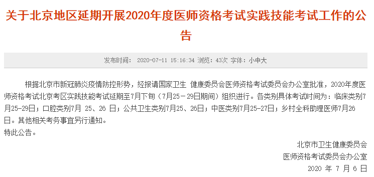 根據(jù)北京市新冠肺炎疫情防控形勢,經(jīng)報請國家衛(wèi)生 健康委員會醫(yī)師資格考試委員會辦公室批準,2020年度醫(yī)師資格考試北京考區(qū)實踐技能考試延期至7月下旬(7月25——29日期間)組織進行。各類別具體考試時間為:臨床類別7月25-29日;口腔類別7月 25、26 日;公共衛(wèi)生類別7月25、26日;中醫(yī)類別7月25-27日;鄉(xiāng)村全科助理醫(yī)師7月26日。其他相關考務事宜另行通知。