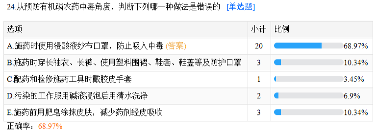 以上就是醫(yī)學(xué)教育網(wǎng)關(guān)于“68.97%正確率:從預(yù)防有機(jī)磷農(nóng)藥中毒角度,判斷下列哪一種做法是錯(cuò)誤的?”的相關(guān)介紹,希望能夠幫助到大家,更多資訊盡在醫(yī)學(xué)教育網(wǎng)公衛(wèi)醫(yī)師欄目!