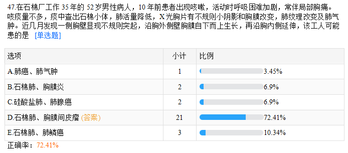 在石棉廠工作35年的52歲男性病人,10年前患者出現(xiàn)咳嗽...