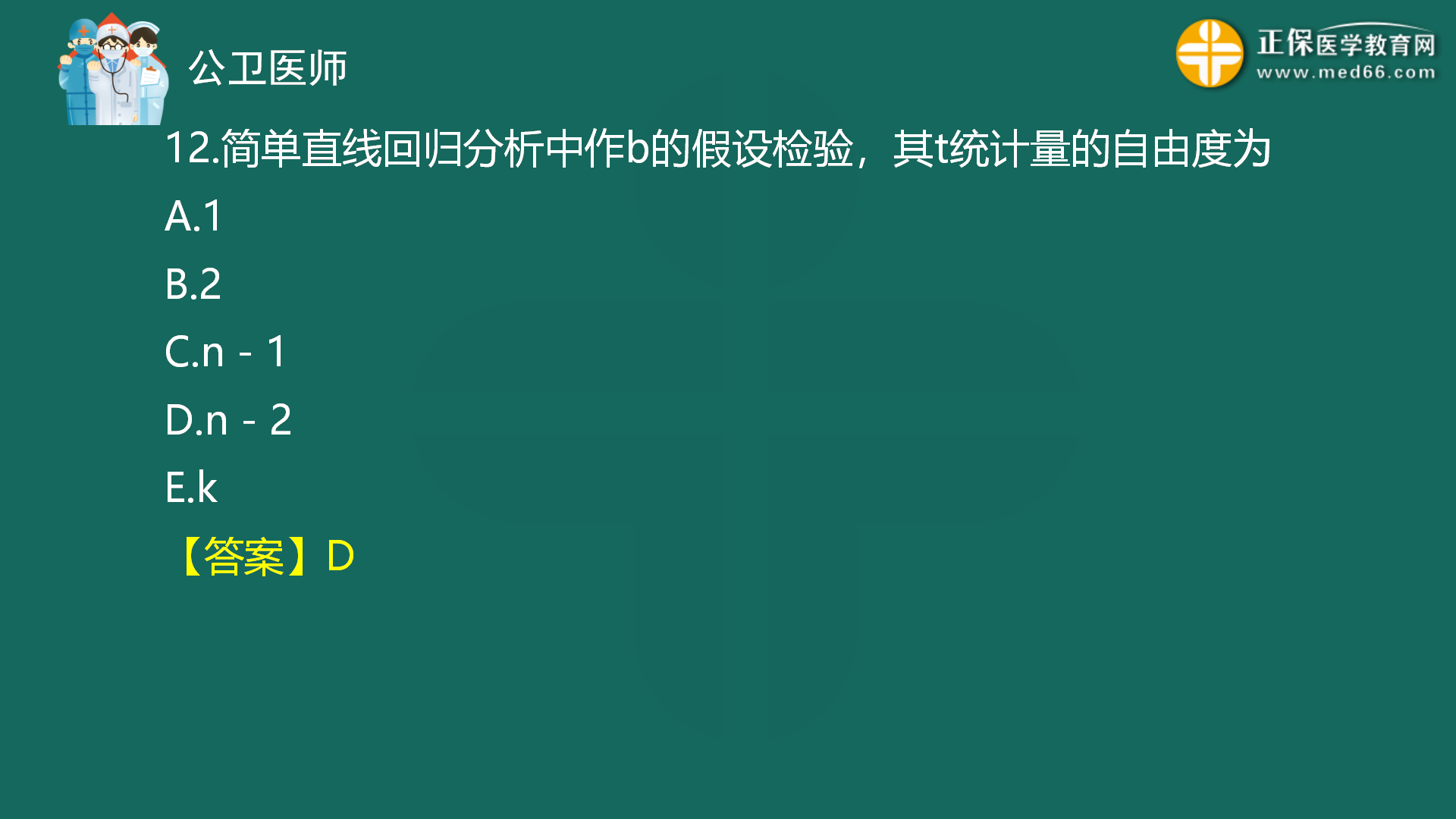 簡(jiǎn)單直線回歸分析中作b的假設(shè)檢驗(yàn),其t統(tǒng)計(jì)量的自由度為?全國2022年公衛(wèi)醫(yī)師模考第二套卷入口持續(xù)開放中(查看詳情>>),醫(yī)學(xué)教育網(wǎng)編輯整理分享疑難易錯(cuò)題有關(guān)內(nèi)容如下: