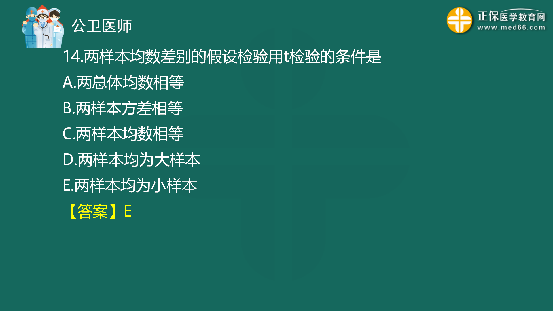 【兩樣本均為小樣本】兩樣本均數(shù)差別的假設檢驗用t檢驗的條件是?全國2022年公衛(wèi)醫(yī)師??嫉诙拙砣肟诔掷m(xù)開放中(查看詳情>>),醫(yī)學教育網編輯整理分享疑難易錯題有關內容如下: