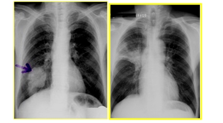 圖中可見肺門不規(guī)則腫塊,根據(jù)部位診斷中央型肺癌