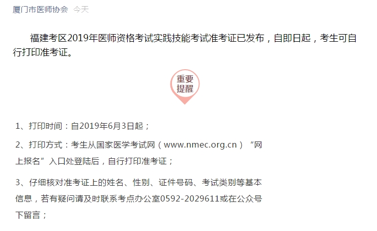 福建考區(qū)2019年醫(yī)師資格考試實踐技能考試準考證已發(fā)布,自即日起,考生可自行打印準考證。