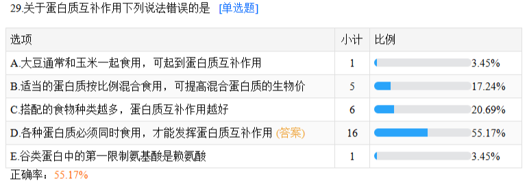 以上就是醫(yī)學(xué)教育網(wǎng)關(guān)于“關(guān)于蛋白質(zhì)互補作用下列說法錯誤的是???颊_率55.17%”的相關(guān)介紹,希望能夠幫助到大家,更多資訊盡在醫(yī)學(xué)教育網(wǎng)公衛(wèi)醫(yī)師欄目!