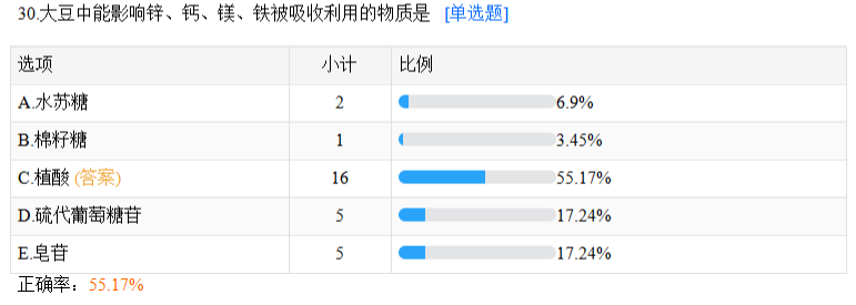 55.17%正確率:大豆中能影響鋅、鈣、鎂、鐵被吸收利用的物質(zhì)是?