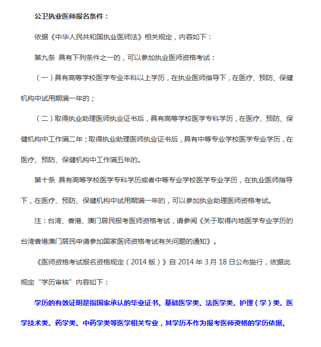 《醫(yī)師資格考試報名資格規(guī)定(2014版)》規(guī)定“學歷審核”寫明:學歷的有效證明是指國家承認的畢業(yè)證書。基礎醫(yī)學類、法醫(yī)學類、護理(學)類、醫(yī)學技術類、藥學類、中藥學類等醫(yī)學相關專業(yè),其學歷不作為報考醫(yī)師資格的學歷依據(jù)。