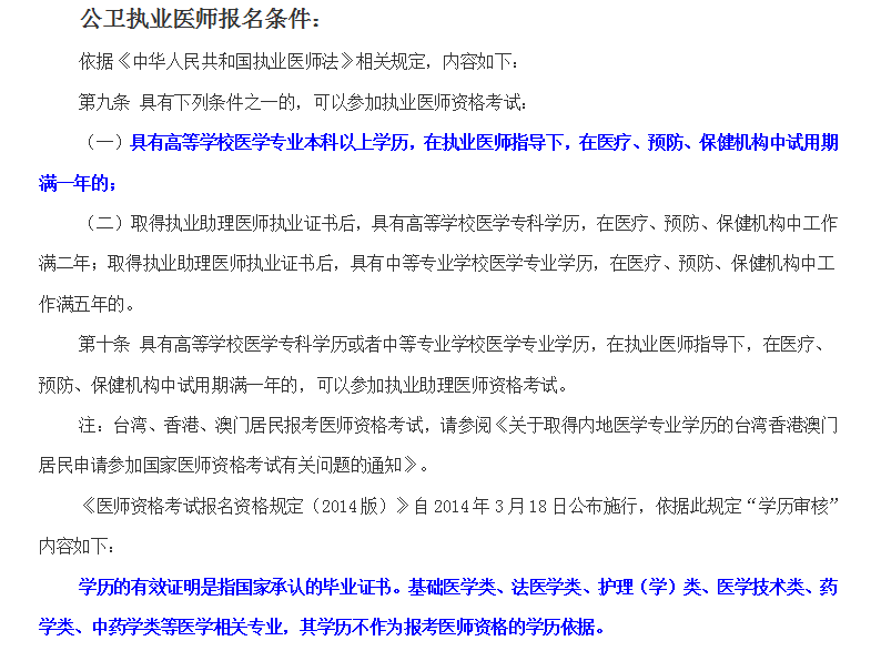 2.2009年12月31日以前入學(xué)、符合本款規(guī)定的醫(yī)學(xué)專業(yè)本科學(xué)歷加注醫(yī)學(xué)專業(yè)方向的,應(yīng)以學(xué)歷專業(yè)報考;2010年1月1日以后入學(xué)的,醫(yī)學(xué)專業(yè)本科學(xué)歷加注醫(yī)學(xué)專業(yè)方向的,該學(xué)歷不作為報考醫(yī)師資格的學(xué)歷依據(jù),經(jīng)國家教育行政部門批準(zhǔn)的除外。