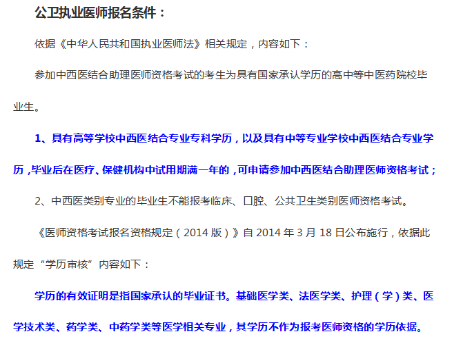 2009年1月1日以后入學(xué)的中西醫(yī)結(jié)合專(zhuān)業(yè)畢業(yè)生(含初中起點(diǎn)5年制專(zhuān)科層次中西醫(yī)臨床醫(yī)學(xué)專(zhuān)業(yè)),其專(zhuān)科學(xué)歷不作為報(bào)考醫(yī)師資格的學(xué)歷依據(jù)。