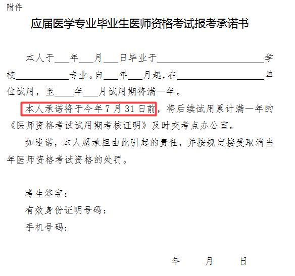 本人承諾將于今年7月31日前,將后續(xù)試用累計滿一年的《醫(yī)師資格考試試用期考核證明》及時交考點辦公室。