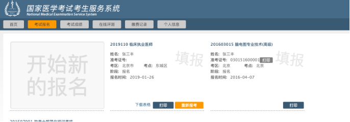 答:如需修改個人報名信息,須在網(wǎng)上報名截止日前,再次登陸服務(wù)平臺,進入“考試報名”欄目,在需要修改的報名下方點擊“重新報考”,然后再重新報名,報名成功后需重新打印《醫(yī)師資格考試報名暨授予醫(yī)師資格申請表》。如下圖:
