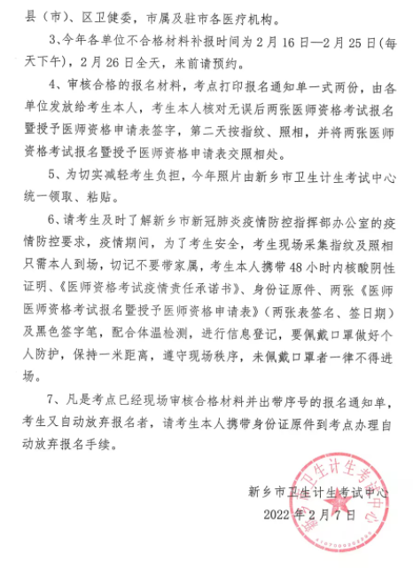 河南省新鄉(xiāng)市2022年公衛(wèi)醫(yī)師報(bào)名現(xiàn)場(chǎng)審核已開始!附具體安排!河南新鄉(xiāng)考點(diǎn)2022年國(guó)家醫(yī)師資格考試報(bào)名現(xiàn)場(chǎng)確認(rèn)工作的通知已發(fā)布,新鄉(xiāng)市定于2022年2月15日至2月27日開展醫(yī)師資格考試報(bào)名現(xiàn)場(chǎng)審核確認(rèn)工作,下面是相關(guān)通知。