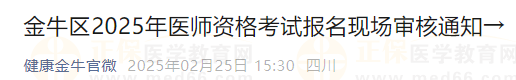 四川成都金牛區(qū)2025年醫(yī)師資格考試報(bào)名現(xiàn)場審核通知,現(xiàn)場確認(rèn)時(shí)間為2025年2月27日—28日、3月3日。醫(yī)學(xué)教育網(wǎng)小編整理官方通知如下:
