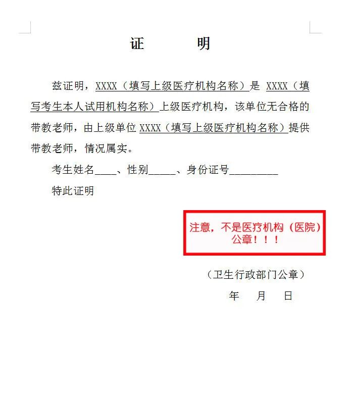 須用上級醫(yī)療機構(gòu)的帶教老師資格證與執(zhí)業(yè)證復(fù)印件并加蓋公章,考核證明需加蓋上級機構(gòu)和本人所在單位公章各一個(兩個章),并出具醫(yī)聯(lián)體證明,并加蓋衛(wèi)生行政部門公章,無醫(yī)聯(lián)體證明的,需填寫附件《上級醫(yī)療機構(gòu)出具帶教老師的證明》加蓋衛(wèi)生行政部門公章,附件下載方式見文末;