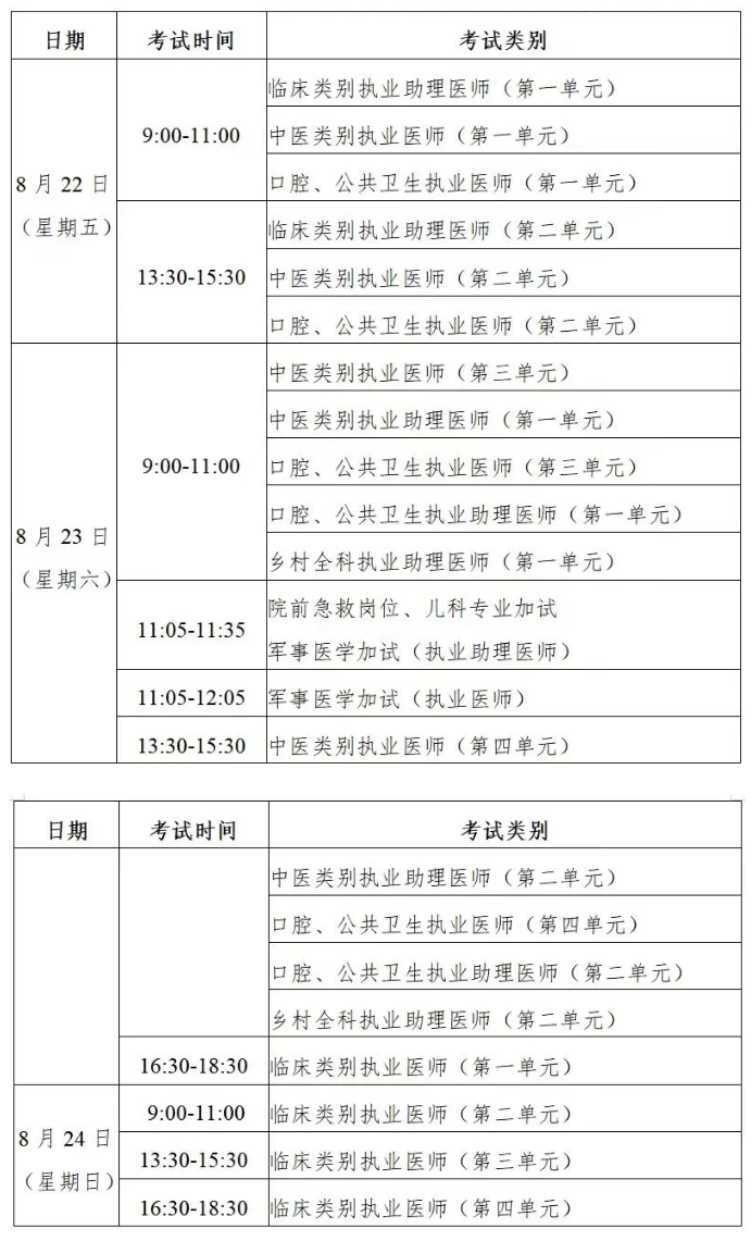 2025年繼續(xù)開展醫(yī)師資格考試臨床類別、中醫(yī)類別具有規(guī)定學(xué)歷中醫(yī)醫(yī)學(xué)綜合考試“一年兩試”試點(diǎn)。在安徽考區(qū)已報(bào)考當(dāng)年醫(yī)師資格考試,實(shí)踐技能考試合格成績(jī)?cè)谟行趦?nèi),未通過第一次醫(yī)學(xué)綜合考試且無違紀(jì)違規(guī)行為的考生,和第一次醫(yī)學(xué)綜合考試缺考及未繳納考試費(fèi)的考生,可報(bào)名參加第二次醫(yī)學(xué)綜合考試,考試時(shí)間如下:
