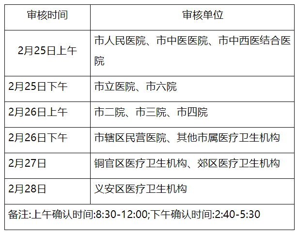 市區(qū)報名點:市衛(wèi)健委7樓704室(銅陵市淮河大道北段1號,咨詢電話:0562-2820601),負責(zé)市直和義安區(qū)、銅官區(qū)、郊區(qū)考生的現(xiàn)場審核。市區(qū)報名點現(xiàn)場審核安排如下:
