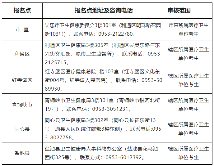 (三)現(xiàn)場確認(rèn):通過現(xiàn)場資格審核人員于2025年3月10日前由各縣(市、區(qū))衛(wèi)生健康局指定專人到吳忠市衛(wèi)生健康委員會3樓301室(利通區(qū)明珠路花園街103號)進行資格現(xiàn)場確認(rèn)。軍事醫(yī)學(xué)、加試考生由自治區(qū)衛(wèi)生健康干部培訓(xùn)中心(銀川市興慶區(qū)勝利街528號)進行確認(rèn)。