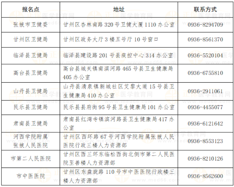張掖考點下設(shè)市衛(wèi)生健康委、甘州區(qū)、臨澤縣、高臺縣、山丹縣、民樂縣、肅南縣衛(wèi)生健康局及河西學院附屬張掖人民醫(yī)院、市第二人民醫(yī)院、市中醫(yī)醫(yī)院10個報名點。各報名點具體負責考試報名現(xiàn)場確認、相關(guān)證明材料收集審核等工作。市疾控中心、市婦幼保健院、市中心血站及軍隊考生的報名工作由市衛(wèi)生健康委負責;河西學院附屬張掖人民醫(yī)院負責本院及河西學院醫(yī)學院、河西學院第二附屬人民醫(yī)院考生報名;各縣區(qū)分別負責轄區(qū)范圍內(nèi)公立、私立醫(yī)療機構(gòu)考生報名。