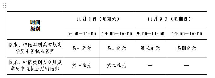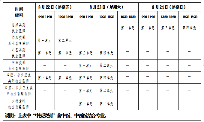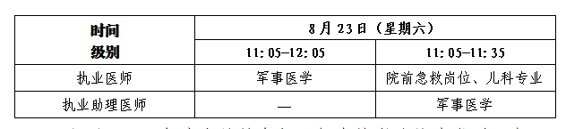 醫(yī)學(xué)綜合考試考試實(shí)行計(jì)算機(jī)化考試,軍隊(duì)現(xiàn)役人員加試軍事醫(yī)學(xué),院前急救崗位和兒科專業(yè)加試相應(yīng)內(nèi)容。全國(guó)考試時(shí)間如下: