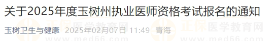 關(guān)于2025年度玉樹州執(zhí)業(yè)醫(yī)師資格考試報名的通知